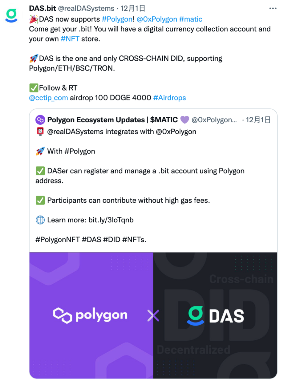 距离 DAS 宣布支持 BSC 之后仅仅过了一周,DAS 就完成了对 Polygon 链的支持,可见 DAS 团队的迭代速度非常迅速。
