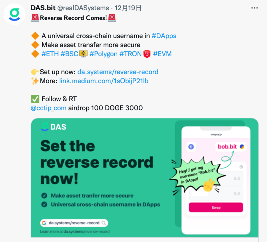 像这样的例子还很多,试想 Discord 聊天工具,如果直接用钱包登录。总之,Web3.0 下,任何用到昵称的地方,DAS 都有一席之地,用的这正是 DAS 的反向解析的能力。
