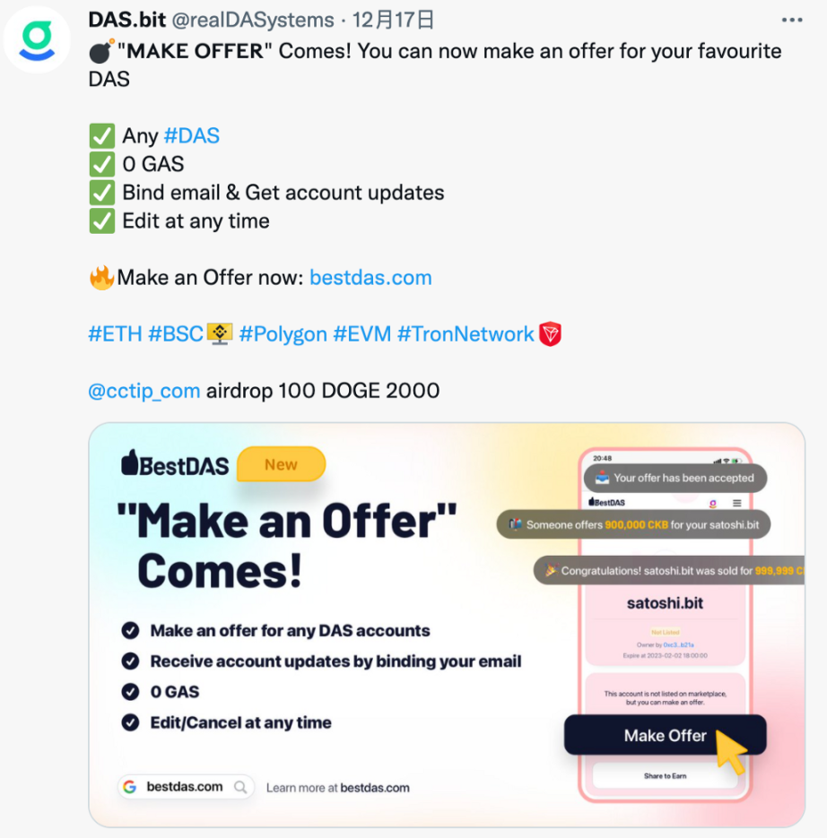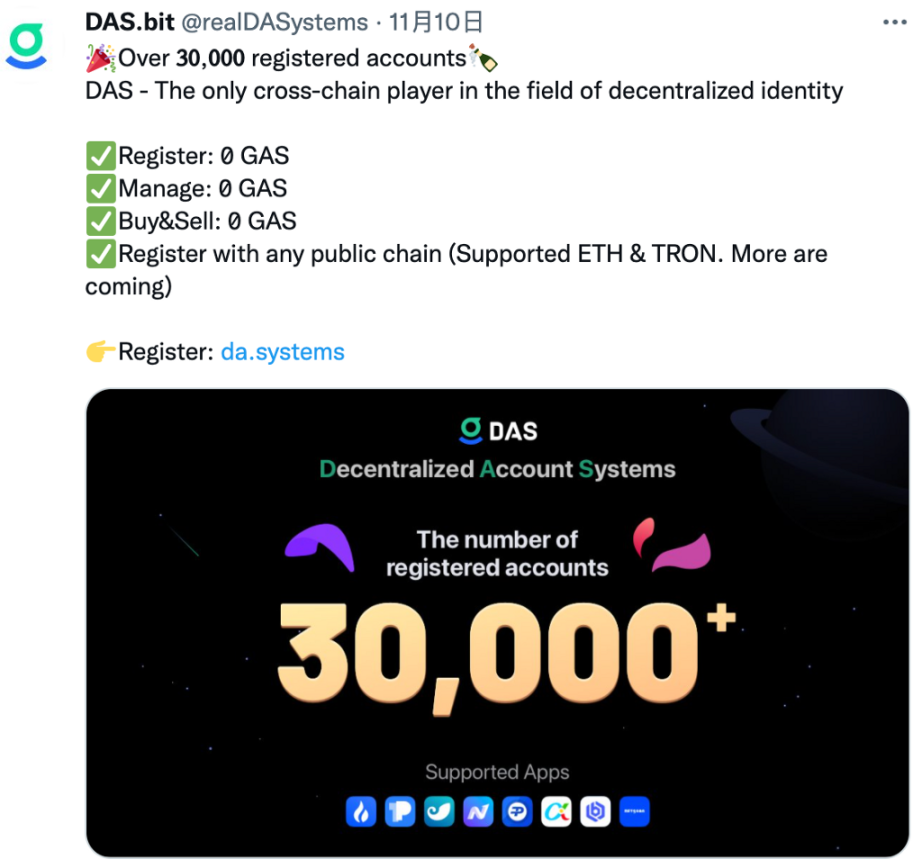 综上,多链的特性使得用户可以使用几乎所有链的地址来注册并管理 DAS 账户,覆盖到整个区块链的人群;轻量级的 SDK 使得应用开发者可以方便快捷地集成;用户门槛低、0 Gas 费用将有利于获客。DAS 走在正确的道路上,假以时日,必将崛起!