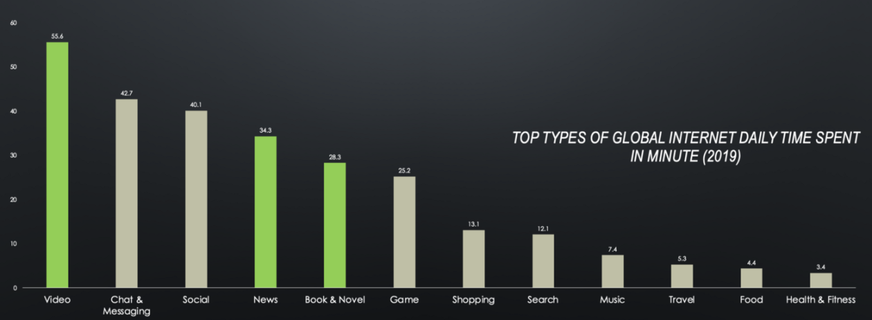下图是以分钟为单位的全球互联网每日使用时间的主要类型(2019 年)