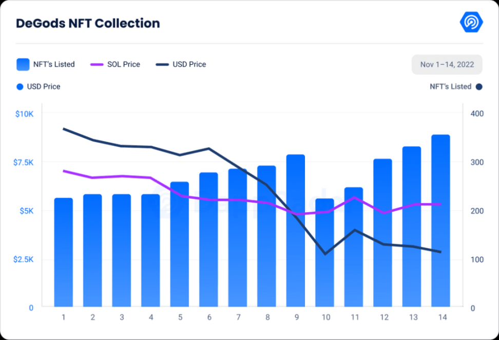 自 11 月 1 日以来,Solana 的 NFT 交易量增长了 380%,NFT 销售量增长了 396%。值得注意的是,自 11 月 1 日以来,领先的 NFT 系列 DeGods 的底价以 SOL 计算下降了 24.01%,以美元计算下降了 69.11%。此外,上市 NFT 的数量增加了 58.04%。