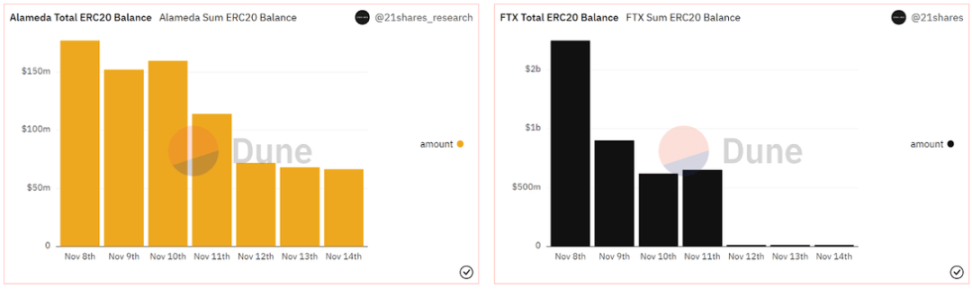 根据 Dune Analytics 的数据,截至 11 月 8 日,属于 FTX 和 Alameda Research 的钱包总额分别为 17.5 亿美元和 1.773 亿美元。11 月 14 日,两个钱包的净值均大幅缩水,分别缩水 94% 和 69%。