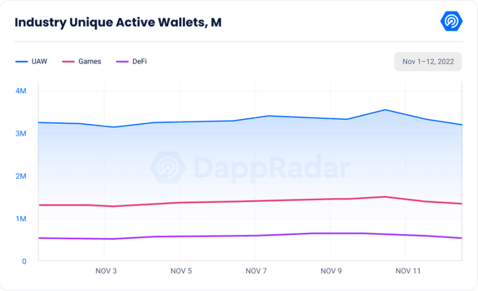 DeFi UAW 在 11 月 9 日和 10 日达到顶峰,两天都达到近 500,000 UAW,DeFi 活动现在回到了上个月的水平(40 万 UAW)。FTX 崩溃似乎对游戏 dApp 影响不大,因为 UAW 在 11 月 10 日达到顶峰,接近 900,000。