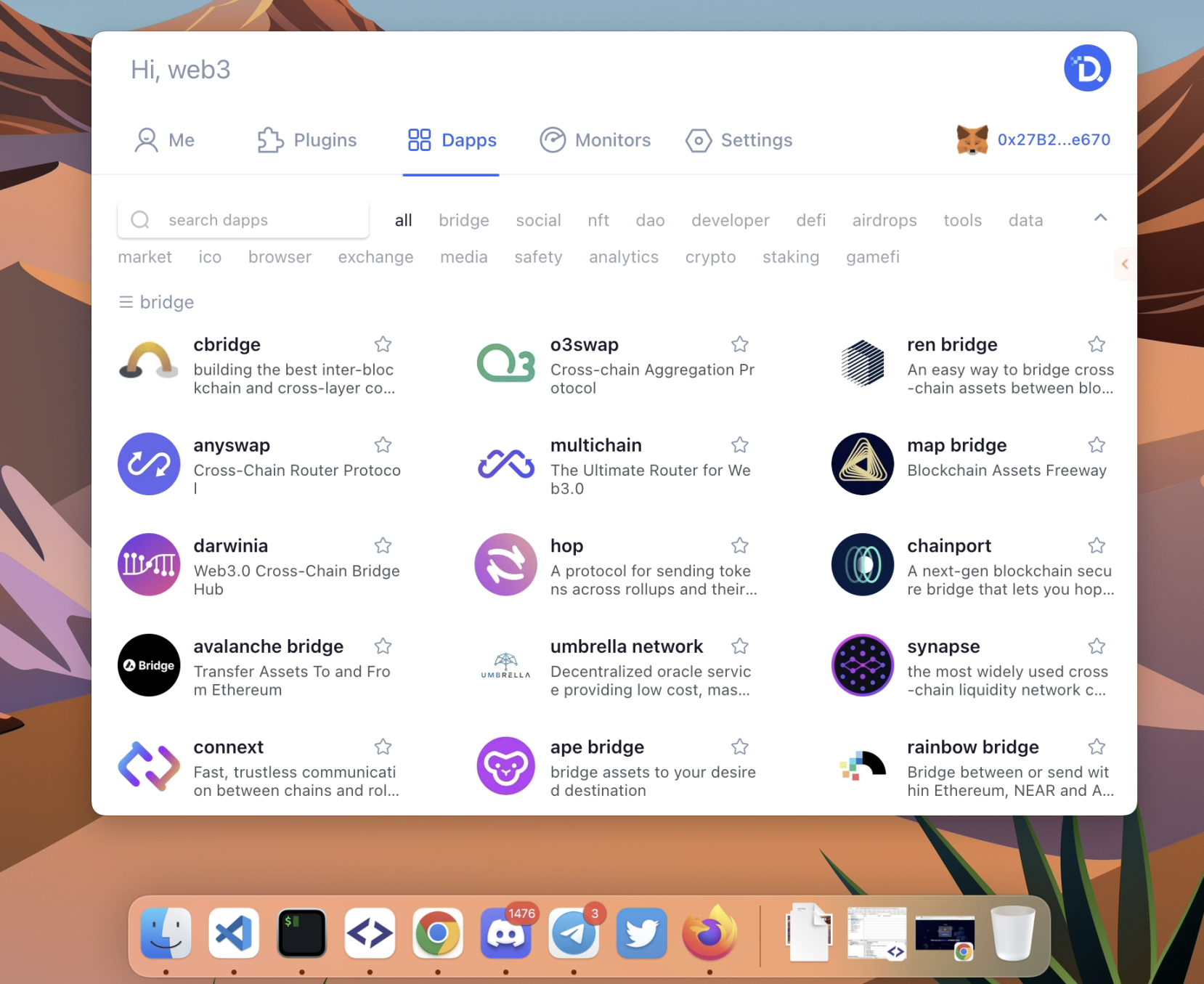 Dtools 组建了专业的 DApp 调研小组,目前收集了来自 Web3 世界 2000 多个不同链的 DApp,并不断更新和维护。同时,辅以清晰的分类, 方便用户浏览、查看和收藏自己喜欢和常用的 DApp。所有 Dapp 都支持通过高性能桌面搜索引擎一键直接访问,解决了传统浏览器收藏夹难以管理的问题。只要输入关键字就可以自动搜索出对应的 DAPP,非常方便。如果使用过 Mac 的 Spotlight,和那个体验是一样的。