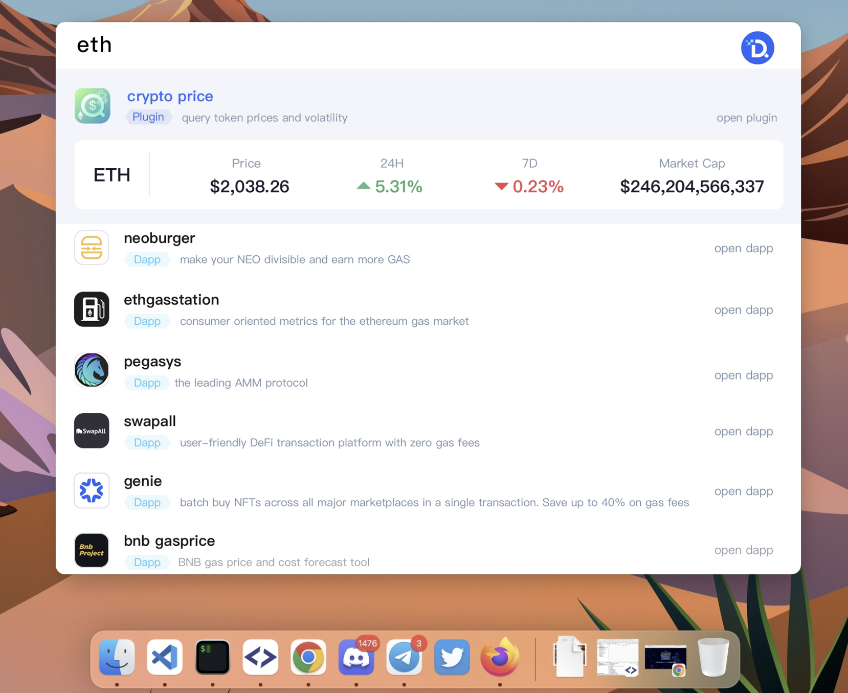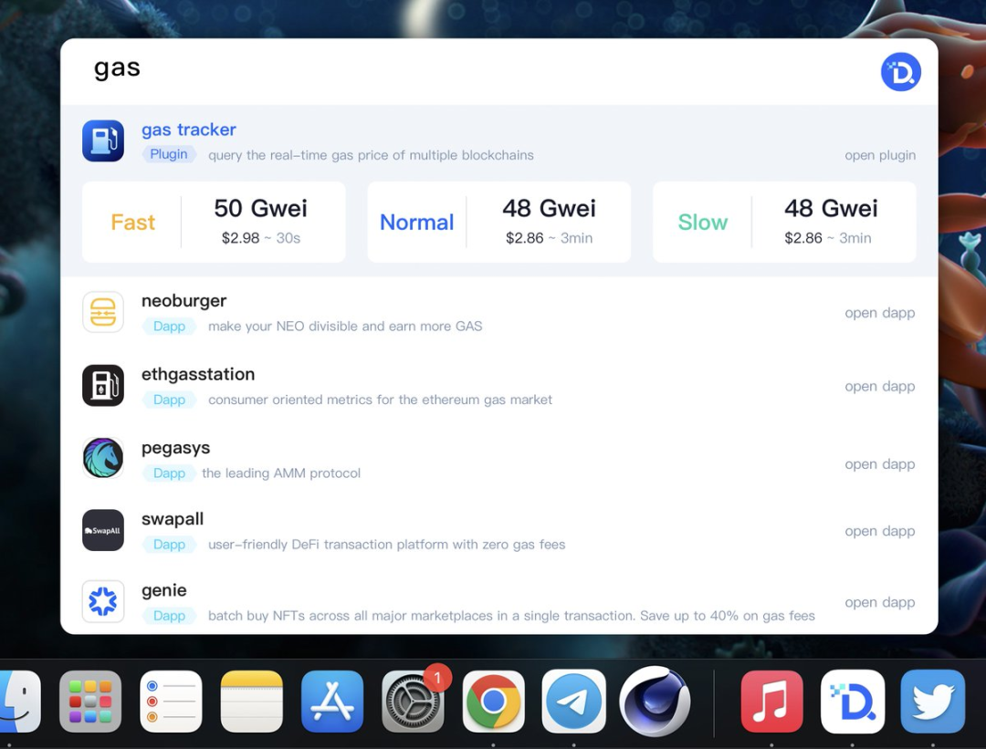 进入客户端,用户只需要在 Dtools 内任意输入一串你想了解的关于 Web3 世界 的关键字,Dtools 将会像 Apple 的 Spotlight 一样为你精准提供你想知道的信息。