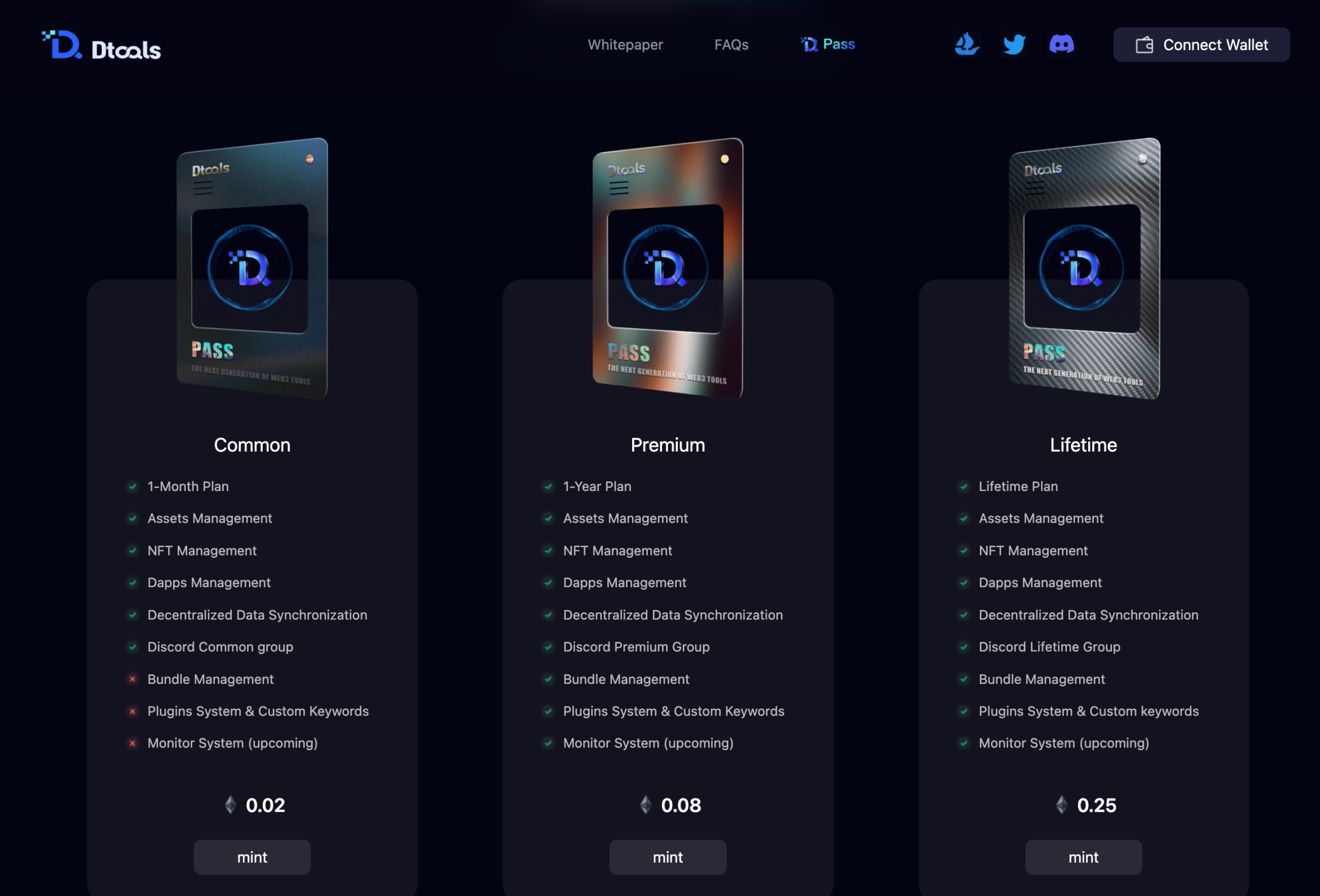 A:Dtools Pass 是一个标识符,由我们发给每个 Dtooler。持证人员可在通行证有效期内享受解锁所有高级功能和技术专家支持。该 pass 在 ETH 主网下发,执行 ERC721 协议。