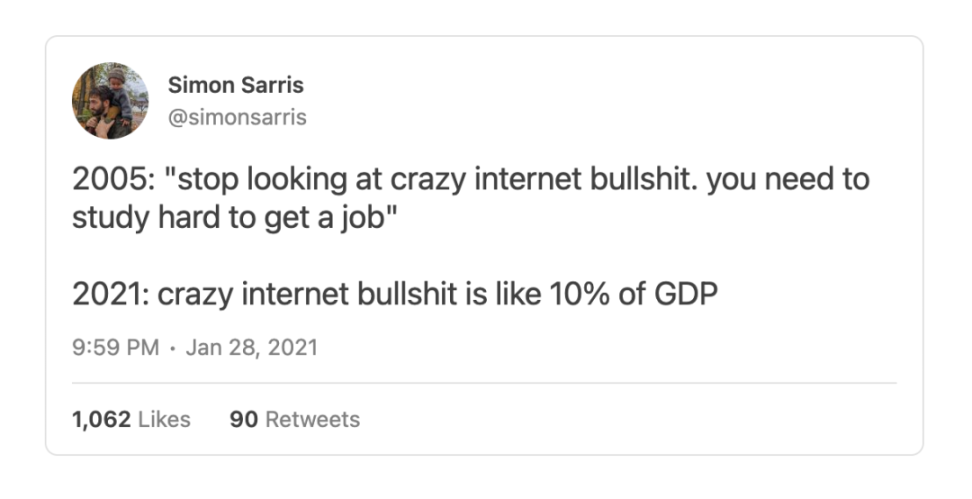 我开足马力写了这篇长文,因为在过去的一周里,它在我的脑海中完全是沸腾状态,各种荒谬想法层出不穷。如果你想对 GameStop、Reddit、Robinhood 和股票操纵系列事件有一个连贯的解释,请阅读《纽约时报》 刊载的 Taylor Lorenz 的 这篇文章。同时,我将以略有不同的方法对这个主题进行剖析:轶事、抽象、怀着对我们不幸经历的 21 世纪经济充满怨恨进行投资。