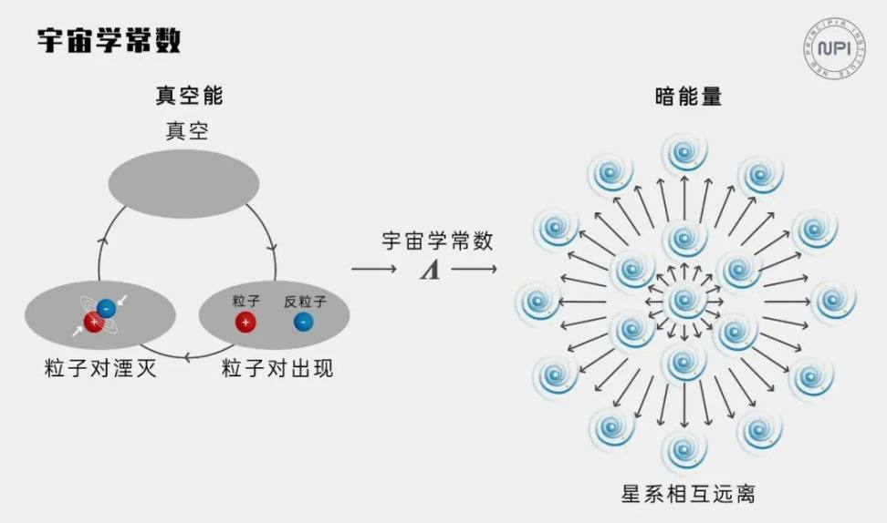 1998 年,天文学家惊讶地发现宇宙不仅在膨胀,而且还是在加速膨胀。仿佛有一股神秘的力量在使我们的宇宙膨胀得越来越快,驱动这种加速的力量被称为“暗能量”。宇宙学家还完全不清楚暗能量的本质,但一种最有力的可能解释是,暗能量的来源其实就是宇宙学常数——换句话说,是真空能。根据量子物理学,真空并不空,而是充满了量子涨落——在真空中,虚粒子会不断地出现,仅持续非常短暂的瞬间就会再次消失。