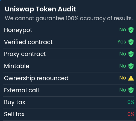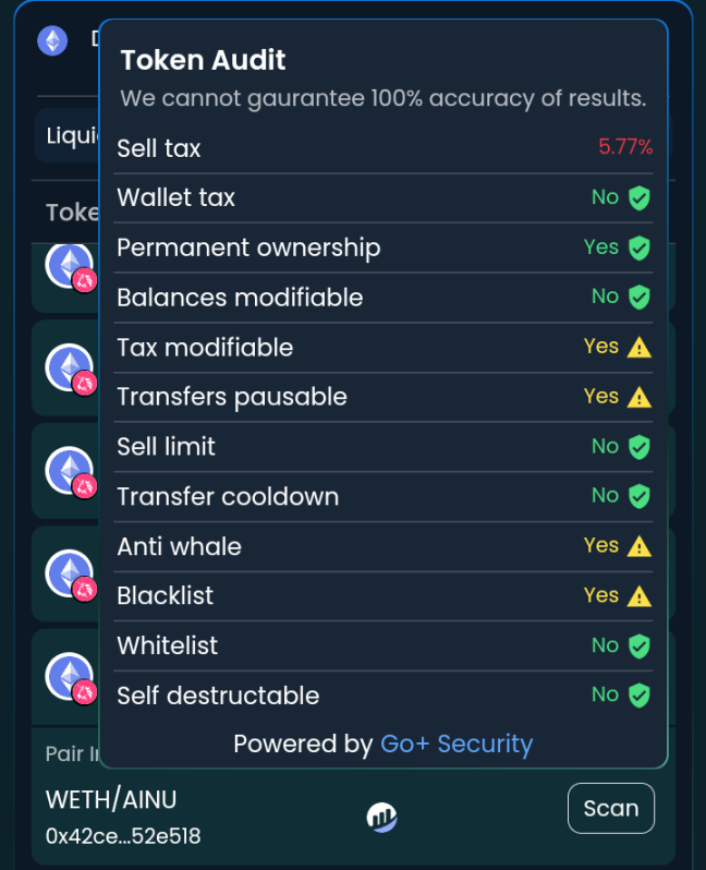 通过接入该服务, DexCheck 在 New Tokens 和 Charts 两个功能页面新增了安全检测功能,这意味着,当用户在 DexCheck 的 New Tokens 页面追踪新代币时,会自动触发对于该代币的实时安全风险监测,一旦发现问题,会对用户进行风险提示。此外,用户还可在 Charts 页面查看代币关于安全风险项的更多细节和分析。