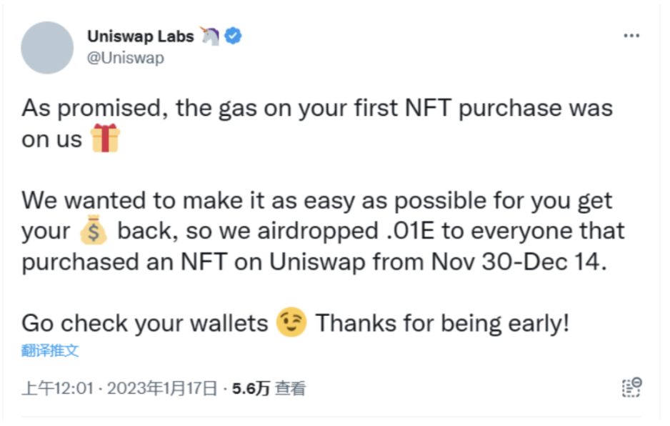 Uniswap 发布空投公告,向 2022 年 11 月 30 日至 12 月 14 日在 Uniswap 购买过 NFT 的用户空投 0.01 枚 ETH,以抵消用户首次购买 NFT 所花费的 Gas 费。