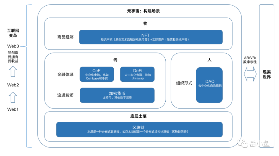 Web2 的流量见顶再加上政策的收紧,使得移动互联网行业已经没有什么大的业务发展空间,因此国内的互联网巨头们纷纷转向线下或者海外,寻求新的增长点。作为一个从业者、一个互联网大厂的螺丝钉,自己这个普通个体感受到的则是在日常工作中会觉得非常琐碎和沉闷,因为接触到的都是非常成熟的产品和玩法,没有什么创新了。因此在 2022 年年初萌生了跳槽的想法,断断续续找了几个月,可移动互联网的各个赛道已经成为红海,内卷无比,一时之间不知道该选择什么方向,但在无意间接触到了 Web3 行业。主动了解这一行业后,产生了一种很兴奋的感觉,因为看到这个行业就像自己刚上大学时初次体验到移动互联网时一样,第一直觉就是这个就是未来、这是一场颠覆式的变革,这种久违的兴奋促使我下定决心跳槽。不过,从互联网大厂跳槽到一个 Web3 公司,确实需要一些勇气。自己放弃的是大公司的平台光环、平台规模、一定的稳定性,面临的是小公司的业务发展不确定性、组织不稳定性。首先是钱,钱的多少是公司对这个职位重视程度的直接体现,因此是最硬性的衡量标准。新公司给了足够的钱,那么这一条算是达到了最基本的要求;然后是关于人,直属主管决定了自己成长速度和工作舒适度,在面试结束并拿到 offer 后,又找了直属主管单独沟通了一轮。整体来说,自己未来的主管是一个能力很强且愿意教导下属的人;最后,关于要做的事,也就是业务,新的赛道正在快速发展,如果自己的努力可以叠加行业大势,那么最终获得的是数倍于埋头苦干的成果。既然钱、人、事都满足了,面对其他的劣势和风险,自然都可以弥补掉了。风险与收益并存,不可能什么都想要,知道自己想要什么,抓住主要矛盾,放掉次要矛盾即可。毕竟自己还年轻,需要进入一个新兴的行业以博取更高的收益,这个是自己真正想要的和需要的。虽然行业转变很大,但是回顾自己过往的三段工作经历,其实是一脉相承的,有统一的主题,也就是交易平台。第一段做的是理财产品的 C 端产品经理,建立了产品经理的基本认知和基本功,比如功能设计、用户调研、数据分析等;第二段做的是金融产品的 B 端产品经理,面向 B 端商户,构建开放平台,与外部金融机构进行对接;第三段则是交易平台的资产端产品经理,离底层资产更近、离区块链更近,包括资产托管、区块链钱包、公链等。不过,转变赛道,就像进入了一个全新的世界,会打破自己过往的许多思维定式和思考惯性。在入行的半年多里,自己不断在输入和输出,之前输出的文章算是记录了自己的成长过程,这里总结一下自己作为一个行业新人的学习路径:(1)对于 Web3 新人来说,直接去了解底层逻辑和技术原理,可能比较枯燥,也难以把握方向,因此需要先整体了解下这个行业的全貌,知道每个赛道、每个模块起到了什么样的作用,这样才能更有目标地去针对性学习。其中最核心的就是行业全景图,对标传统互联网行业的“人货场”,Web3 同样可以分为“人钱物”,将各种新概念整合了起来。(2)了解了行业全貌之后,我们需要补足基础,了解整个行业的基础知识,我们需要从行业鼻祖——比特币开始学习。这篇文章是从货币的起源开始讲起,系统地分析比特币出现的背景以及解决的问题。文章比较长,可以直接阅读开头和结论部分。(3)了解了比特币之后,然后我们需要了解区块链 2.0 时代的龙头——以太坊。如今各类去中心化应用出现和生态的繁荣,都是依托于以太坊的智能合约。因此,深入了解以太坊是非常必要的,可谓是一通百通,了解了以太坊之后,我们就可以了解目前的公链格局以及未来的发展方向了。(4)当我们了解了底层的区块链知识之后,此时我们可以来到应用层,首先要看下 Web3 世界的金融基础设施。关于 DeFi 赛道的详细介绍,可以阅读这个系列的文章:(5)对于去中心化应用,除了产品逻辑之外,还有一个核心的“发动机”就是代币经济模型。如果代币经济模型设计得好,不但在初期可以为产品吸引更多的用户,更关键的是可以让项目能够可持续发展。(6)元宇宙其实是“场景”,本质是数字经济,也就是人们怎么在“元宇宙”这个场景中进行各类活动。NFT 是这个数字世界的商品经济,人们可以使用数字货币进行消费。就像移动互联网时代,电商的兴起使得在线支付得到了普及;而在 Web3 时代,NFT 的出现使得数字货币有了更多的应用场景。NFT 不只可以代表数字资产,也可以是现实世界资产的映射,NFT 的繁荣代表了 Web3 世界的商品经济的成熟。关于 NFT,可以看下我的 NFT 探索之旅,能够直观感受下到底什么是 NFT:如今,经过了半年多的 Web3 产品经理的工作,回过头对比 Web2 产品经理和 Web3 产品经理的工作内容,会发现 Web3 产品经理其实在 Web2 产品经理的基本能力上叠加了新的能力点。整体来说,产品方法论是一致的,都是为了服务用户、服务业务,需要从用户(找到目标用户)、场景(自己产品的实际应用场景)、需求(基于特定的场景,满足了哪类用户的哪些需求)出发设计产品。差异点则是因为这个行业有自己的特点,所以在产品思维和产品方法论上存在诸多差异,主要是三个方面:区块链特性 + 代币经济模型 + 全球化产品思维。(1)区块链特性:传统的互联网产品是前后端模式,数据都是存储在本地服务器;而去中心化应用的数据则存储在区块链上,除了对接后端外,前端也会