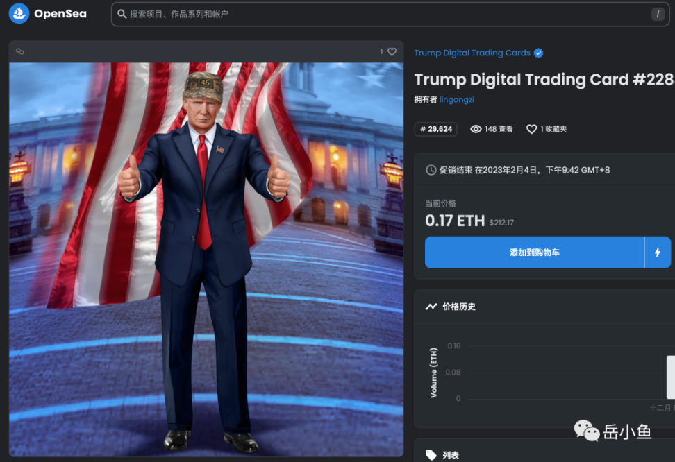 特朗普 NFT 的初始售价是 99 美元一张,自己购买了 2 张,后来最高涨到 800 美元一张,但自己并没有卖掉,目前维持在 200 美元左右。