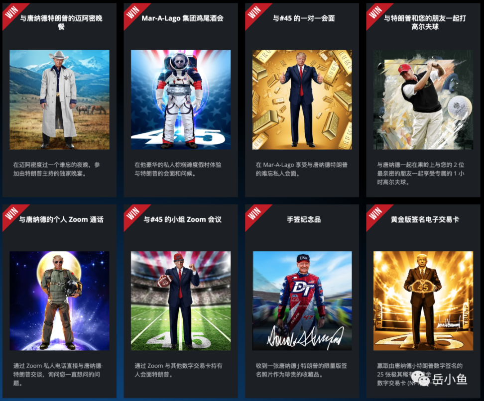 美国前总统特朗普发行了自己的 NFT,购买者凑齐一定数量后,可以抽奖获得与特朗普一起参加活动的奖励,比如和特朗普语音、和特朗普参加晚宴、和特朗普打高尔夫等。