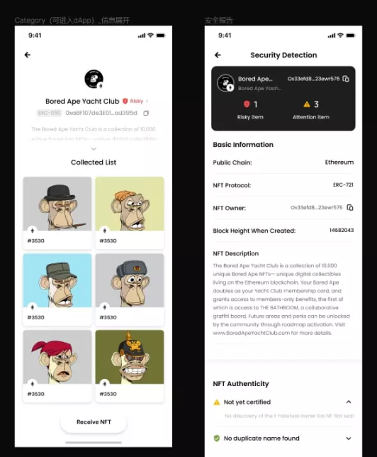 ONTO Wallet 内置的 NFT 市场集成了 NFT 安全检测服务,一旦检测出某个 NFT 项目存在安全风险,将触发风险提示,点击可以跳转到相应的安全报告。