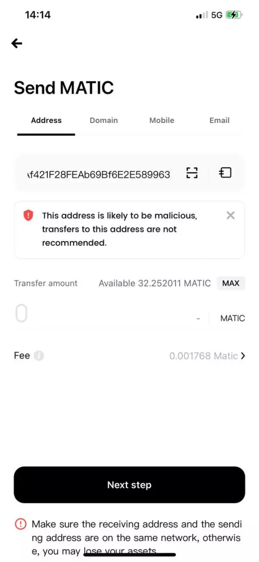 当用户使用 ONTO Wallet 进行转账交易时,ONTO Wallet 会对转账的接收地址进行自动检测,针对钓鱼活动、勒索活动、盗币攻击、恶意挖矿、洗币、混币和金融犯罪等多种风险行为指标进行识别检测,一旦被判定为恶意地址,将对用户进行安全警告,告知用户该地址为恶意地址,不建议用户进行下一步操作。