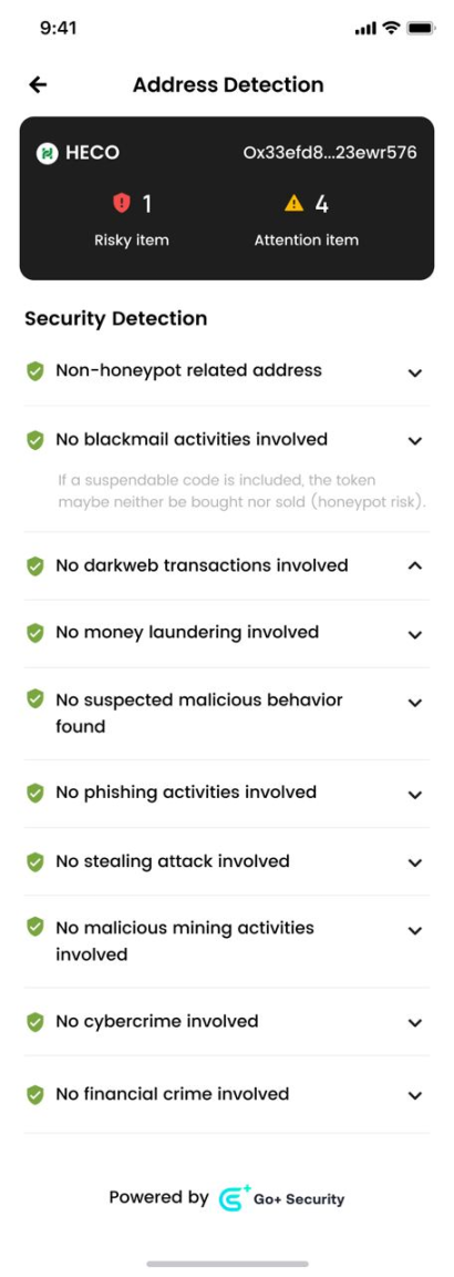 ONTO Wallet 的恶意地址检测服务由 GoPlus 强大的恶意地址检测 API 服务提供支持,该 API 方案不仅支持以太坊、BNB Chain、Polygon、HECOP、Arbitrum、Avalanche 等多条公链,聚合了包括来自慢雾、BlockSec 等多家安全公司的数据源,并且在覆盖面(跨多个公链)、跨资产(ERC 20 和 NFT 均支持)、样本库多样性(来自多家安全公司的数据源及其提供的样本分析模型),收录及时性(以最快速度同步更新和收录市面上出现的最新貔貅资产「注:黑地址最高频出现的地方就是在貔貅资产类别」)和完整度(目前累计黑地址已超十万,该动态样本库仍在持续更新和增长)上,领先市场。