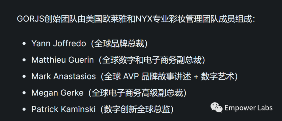 NYX - 欧莱雅旗下的彩妆品牌,相比于它的母公司,这是一个年轻并擅长互联网运营的品牌。它 4.5 亿欧元的年度销售额,只占到欧莱雅集团的 1% 左右,却在 Instagram(类似小红书的海外社交应用)上有 1450 万的关注者。而 GORJS DAO 的主要创始成员均为来自 NYX 彩妆的高管。