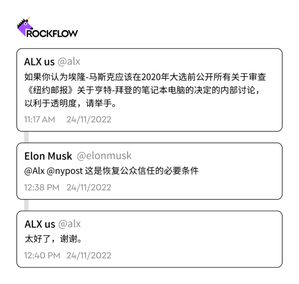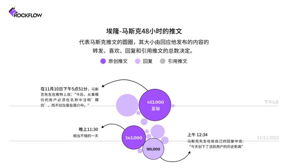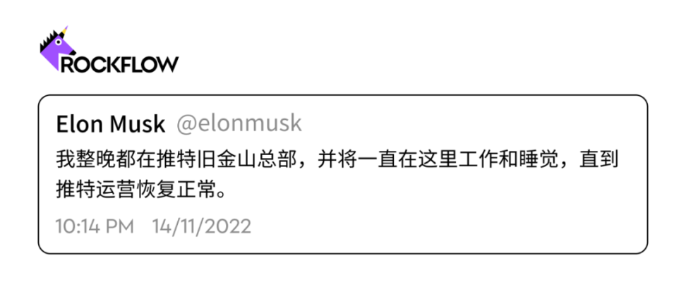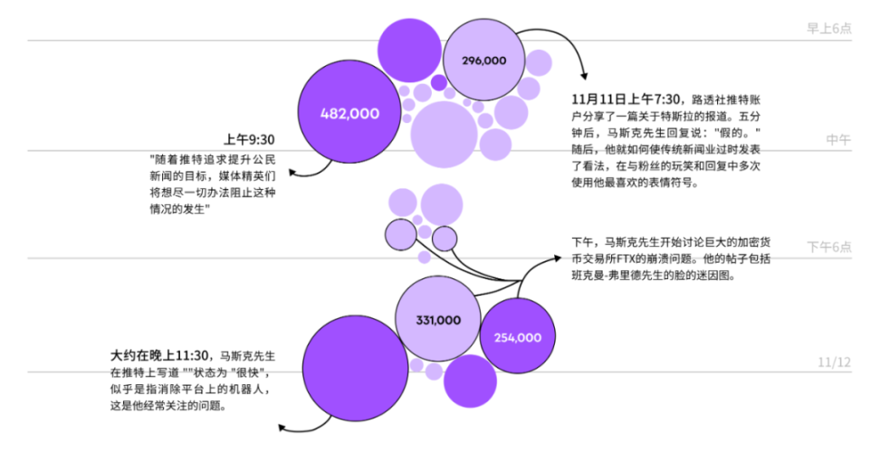 在 11 月的某个 48 小时内,马斯克在他自己的领导下,在社交网络上吹捧创纪录的活动时,共发布了 60 次帖子,包括对加密货币崩溃的评论和对批评他的工作场所政策的激烈回应。当有用户更改个人资料名称模仿他时,他发布了一项关于模仿账户的政策,并且他发布的许多推文很快在他的追随者中流行起来。