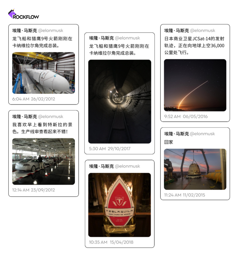 早期使用 Twitter 时,马斯克通常会发布一些宣传生意和业务的照片:SpaceX 火箭发射和特斯拉汽车装配线(以及偶尔的一瓶龙舌兰酒。)