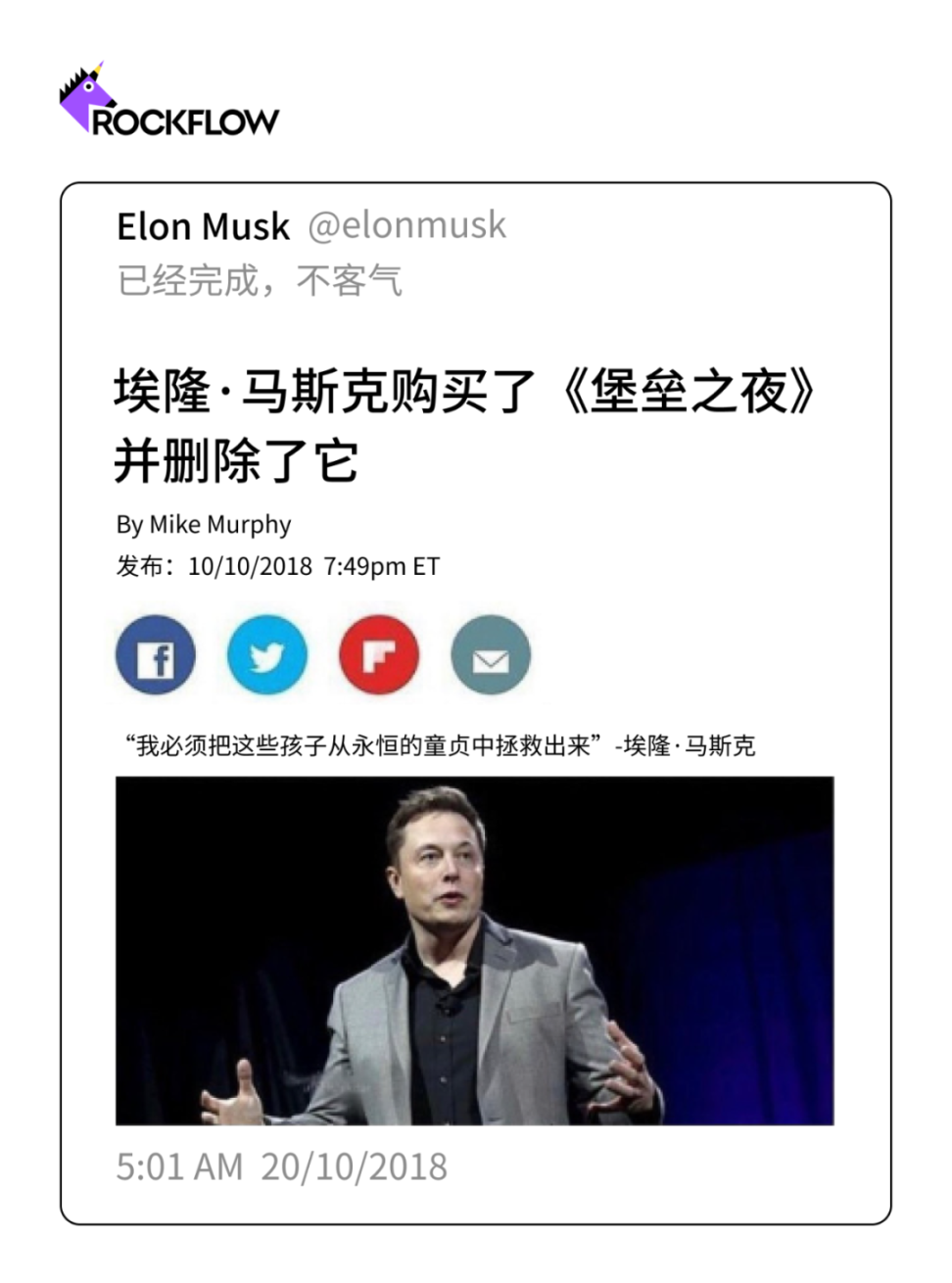 2018 年,当他为实现特斯拉雄心勃勃的生产目标奋斗时,他的发帖行为发生了变化。同年 10 月,他分享了一张假新闻图片,声称为了「让这些孩子免于永远的童贞」,购买了流行视频游戏《堡垒之夜》。