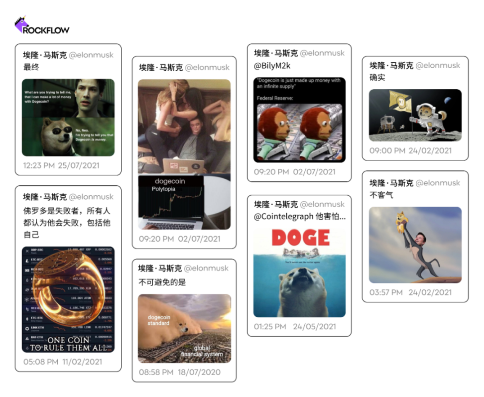 通常,马斯克的更新内容大多是「模因」(也称为「迷因」)——这里指网上被广泛复制和分享的笑话图片或视频。这些模因通常来源于受他的追随者们所欢迎的小众网站或在加密货币留言板里。有些是关于马斯克的,有些看起来是原创的。