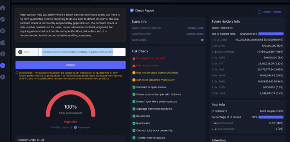 以上面截图中的代币 $RabbitZilla (BSC address:0x2eb038bd15361175de2a21dbb76440e8c95a8e15 ) 为例,检测出两项安全风险,其中,一项为貔貅隐患风险,另一项为隐藏 owner 风险。貔貅安全隐患是一项非常常见的安全风险,一旦出现,意味着该代币无法进行买卖交易,代币会没有价值。而「隐藏 owner」功能则意味着,合约创建者名义上放弃了所有权,实际上依然存在隐藏的 owner 控制代币。