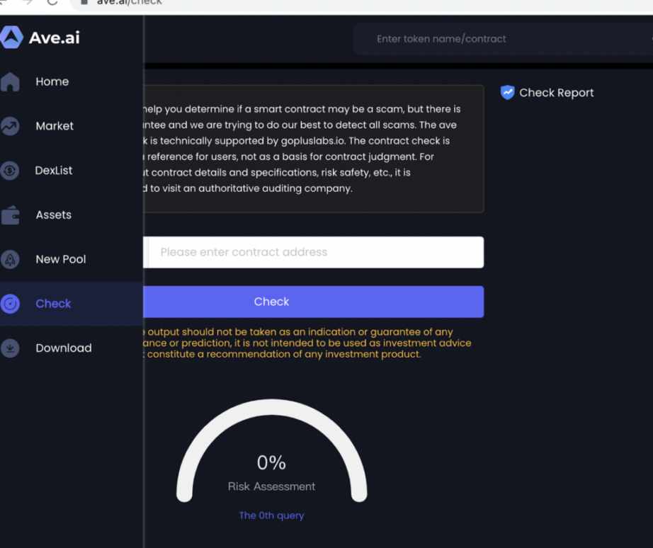 用户点击 AveDex 侧边栏的 Check ,可对目标代币进行安全检测,从交易代币的基本信息、合约安全性、交易安全性和信息安全性几个维度对该交易代币潜在的安全风险进行实时安全检测和评估,一旦发现问题,会对用户进行风险提示。