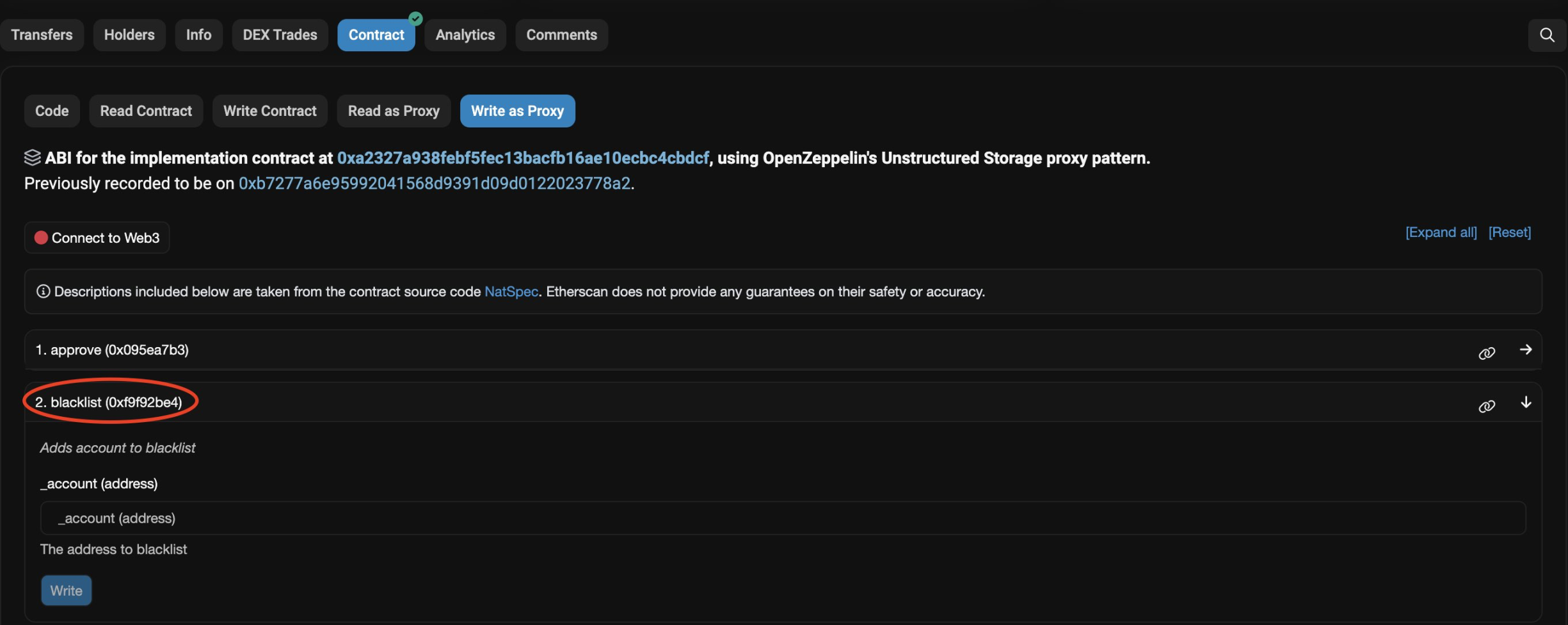 那么为什么说掌握稳定币还可以掌握一些协议的生杀大权呢?如果打开以太坊区块链浏览器找到 USDC 的智能合约,你会发现有一个叫 Blacklist(黑名单)的功能函数,这是干什么的呢?没错,就是个黑名单,可以将任何以太坊上的地址拉黑(包括协议)