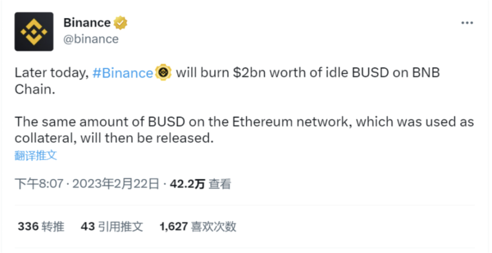 币安将销毁 BNB 链上 20 亿美元的闲置 BUSD币安官方在推特上表示,今天晚些时候,币安将在 BNB Chain 上销毁价值 20 亿美元的闲置 BUSD,然后将释放以太坊网络上用作抵押品的相同数量的 BUSD。情报来源:https://twitter.com/binance/status/1628365742650294278