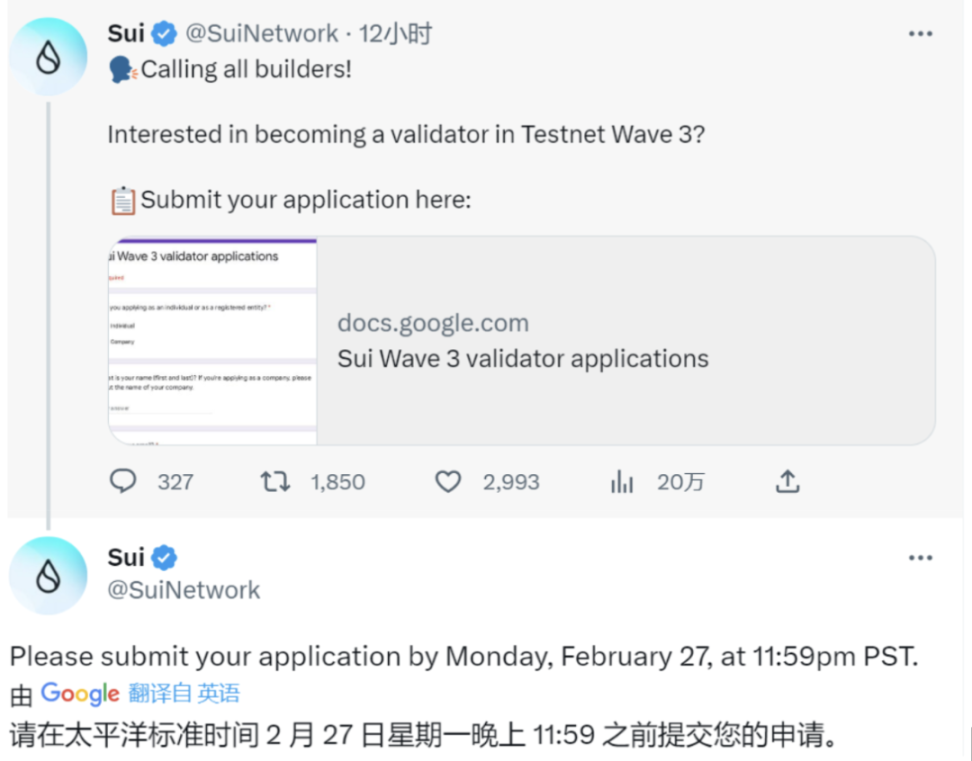 Sui Network 正在招募 Testnet Wave 3 验证者Layer1 公链 Sui Network 宣布已开启 Testnet Wave 3 验证者申请,申请将于太平洋标准时间 2 月 27 日 23:59(北京时间 2 月 28 日 15:59)截止。情报来源:https://twitter.com/SuiNetwork/status/1628524397874278400