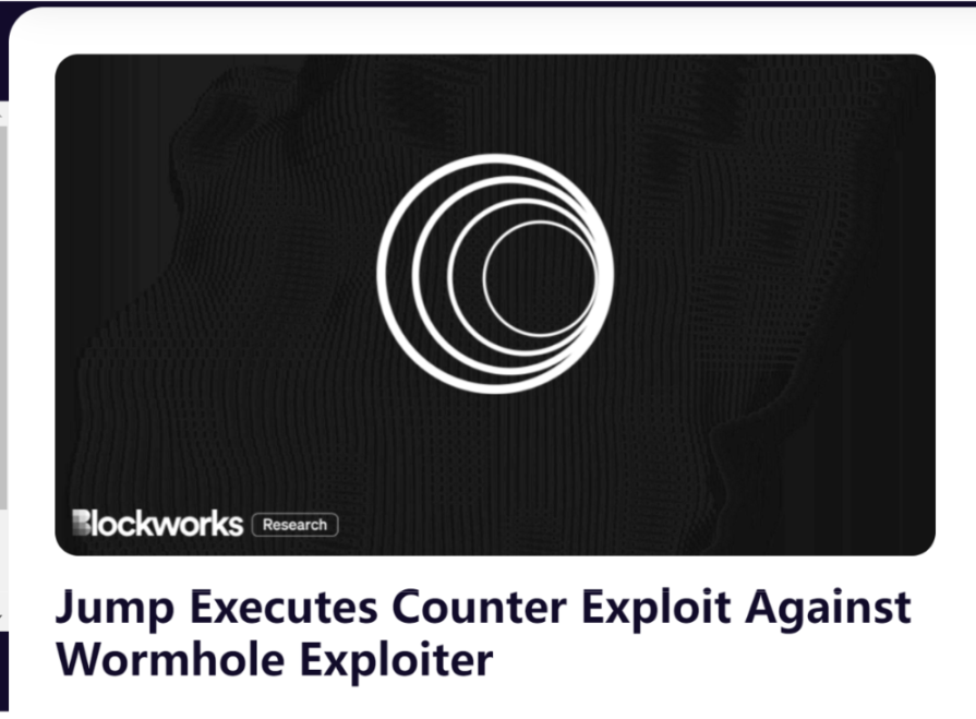 Jump Crypto 与 Oasis 协作,成功盗回被黑的 12 万枚 ETHJump Crypto 和 Oasis 合作,逆向攻击了一个可升级的 Oasis 合约,从最初 Wormhole 攻击者的金库中获得被盗资金。就在一年多以前(2022 年 2 月 3 日),Wormhole 跨链桥遭到黑客攻击,成为加密行业最大规模的安全事件之一。总共有大约 12 万枚 ETH 被盗,当时价值高达 3.25 亿美元。不过该行为也在社区引起很大争议。情报员评论: 一个系统如果保护不了坏人的钱,那么它也保护不了任何人的钱情报来源:https://www.blockworksresearch.com/research/we-do-a-little-counter-exploit