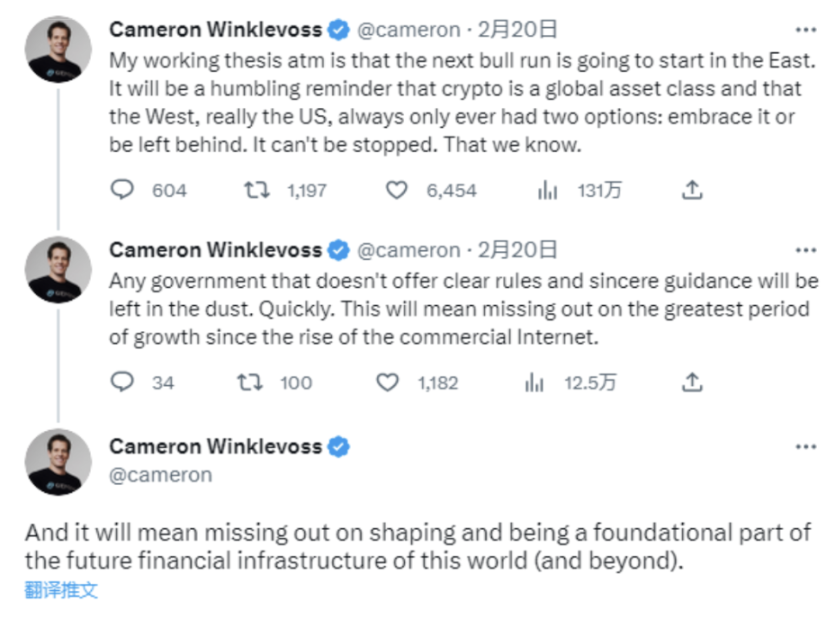 Gemini 联合创始人 Cameron Winklevoss 发推称,下一轮牛市将从东方开始,这将提示人们,“加密货币是一种全球资产类别。”而西方,实际上是美国,只有两个选择:要么接受、要么被抛在后面。不提供明确规则和真诚指导的政府将错过自商业互联网兴起以来最伟大的增长时期,也将错过塑造和成为这个世界(及以后)未来金融基础设施的基础部分的机会。情报员评论:国人要注意了,下一波韭菜将从东方开割。情报来源:https://twitter.com/cameron/status/1627352859216949248
