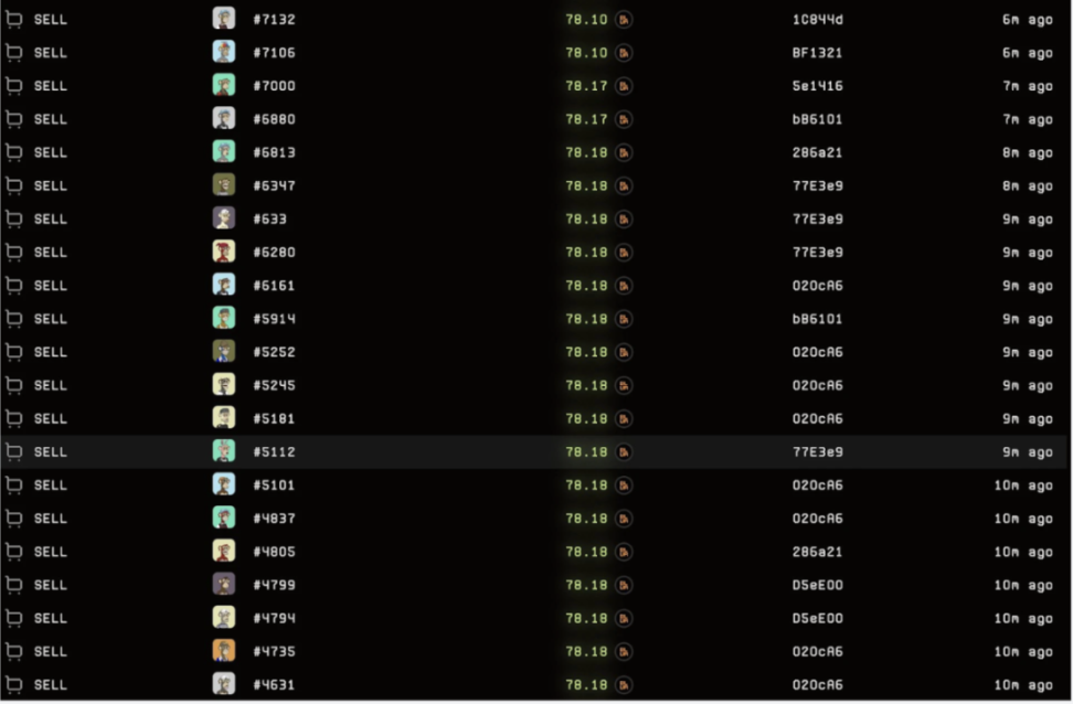 2 月 22 日,NFT 项目 rektguy 创始人 Mando 的地址(0xC8...36e8)在半小时内在 Blur 以约 78 ETH 的均价抛售 71 个 BAYC,以 16.3 ETH 的均价抛售 11 个 MAYC,以 15.14 ETH 的均价抛售 7 个 Azuki,附加几十个 Otherside 和 Beanz。这笔在 10 秒内成交的订单吸引了众人围观,毕竟谁不好奇会是哪个倒霉蛋呢。。根据链上信息以及 Blur 上的交易数据,发现这笔抛售交易的接盘者竟是麻吉大哥的钱包地址(0X020...5872)。情报来源:https://www.odaily.news/post/5185257