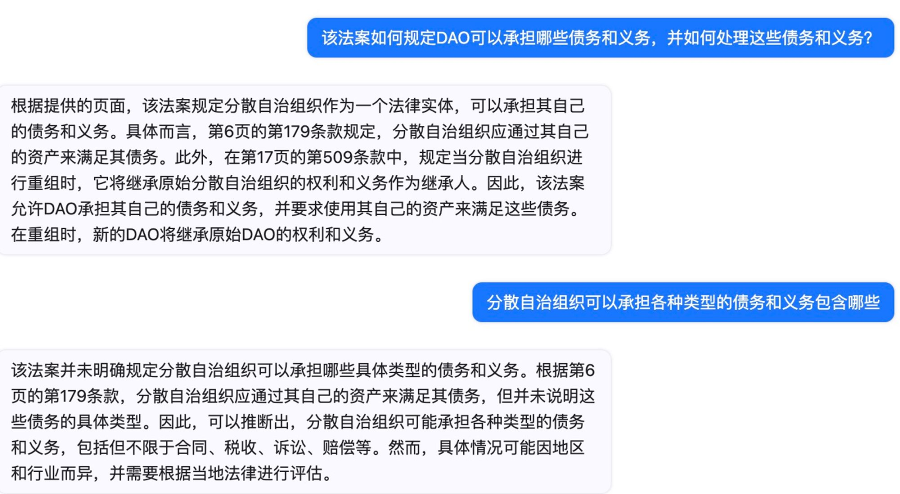 我们看到第八章规定了 DAO 可以拥有哪些类型的资产,并如何管理这些资产。当我重置聊天记录再去问 ChatPDF 时,它告诉我该法案中并没有明确规定