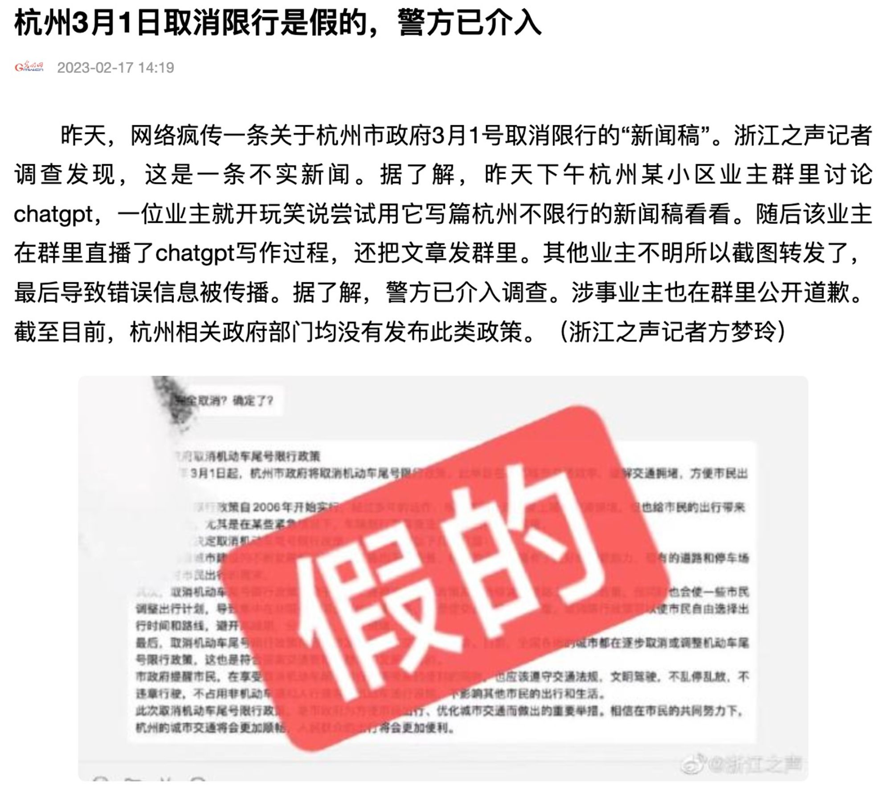 这让我想起了前段时间杭州有人用 ChatGPT 写了一个杭州取消限行的新闻稿被广泛传播,许多人都相信了,那么在未来如果 ChatGPT 被某些人用于一些“特殊用途”,我们真的还能保持判断信息真假的能力吗?