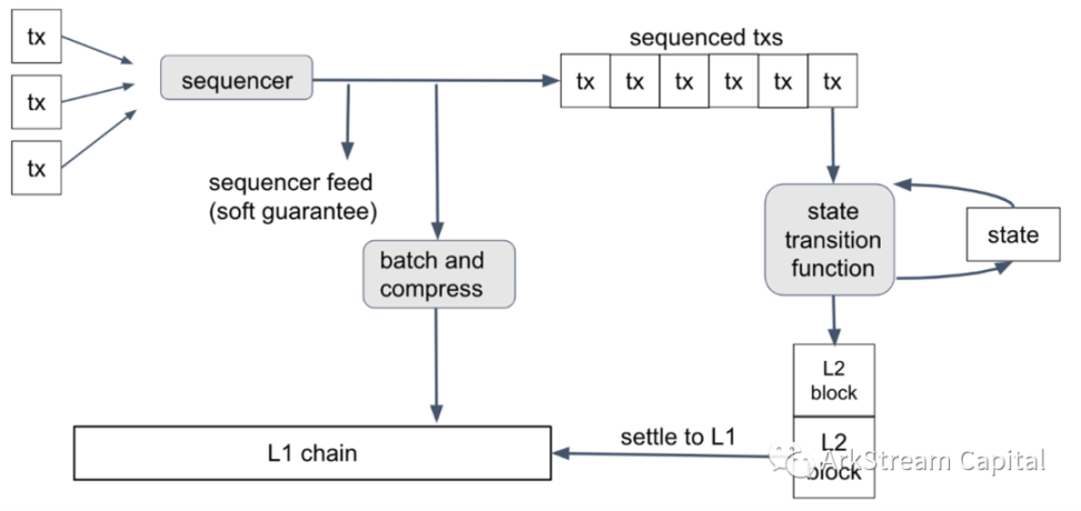 对于模块化区块链的分层理解,极易以单体区块链的思维先入为主,由此会造成不少混淆。此时,可以从用户的视角通过正在运行的以太坊乐观 Rollup 的二层网络 Arbitrum 直观和深入的了解。通过 Arbitrum 白皮书关于二层网络交易流的阐述:可以知道,用户提交的交易不再直接与一层网络进行交互,转由二层网络的定序器进行收集和批量处理,定序器将批量处理的多笔交易原始数据压缩发送到一层网络,与此同时,也会对批量处理的交易进行排序,计算用户和网络状态转变,然后将状态结果发送到一层网络进行结算。