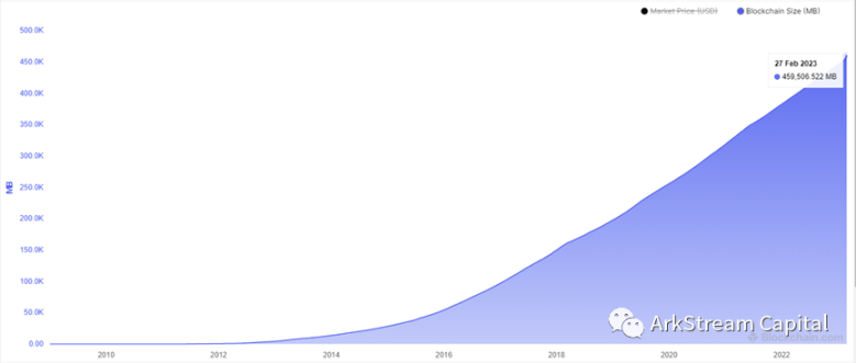 大数据时代和云时代的到来,作为现代社会基础资源的数据,可以在各种决策场景提供帮忙和支撑,其战略地位如同过去的石油一般。当我们提到区块链的数据时,通常指的是链上存储的各种交易数据和智能合约数据。这些数据存储方式和传统的数据库有所不同,从某种角度而言,区块链的数据存储方式是分布式的,即每个节点都要存储一份完整的数据副本。当下,随着链上用户交易数据的活跃以及智能合约的繁荣,区块链数据在线性增长的基础上面,出现指数级增加的迹象。比特币网络从 2016 年 55G 的全网大小,一直按照每年 50G 增长,但是在 2020 年开始,其网络大小的年增长量开始跃迁为 60G,截至当下 2023 年 2 月,全网数据大小是 459G。