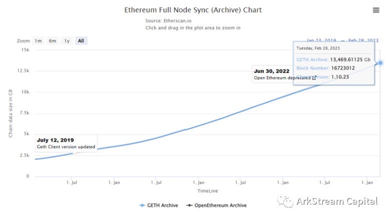 作为世界计算机和智能合约平台,以太坊的全网数据远比聚焦在支付领域的比特币要大得多。通过 Etherscan 可以看到,现在成为以太坊默认全节点至少需要 800 多 G 空间,成为以太坊 Archive 全节点至少需要 13000G 存储空间。