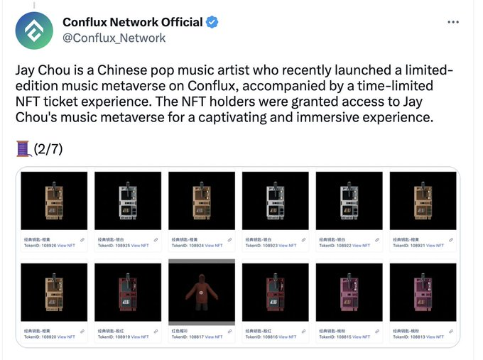 包括前两天 conflux 提出与周杰伦的合作,周杰伦在 Conflux 推出限量版音乐元宇宙,并附有限时 NFT 门票体验,也引发了网友的热议。