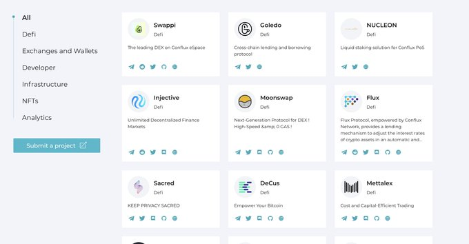总的来说,目前 Conflux 在生态应用方面的水花不是特别大,还没有出现爆款产品。目前 conflux 的生态下包括 defi、交易所、钱包(fluent、anyweb)、infra、NFT 平台(淘派)等等。