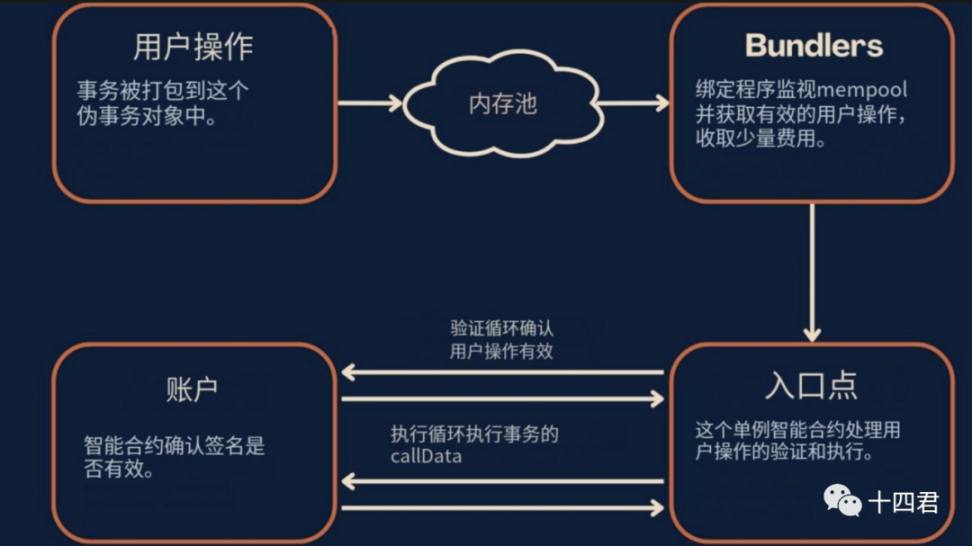 Bundlers 捆绑器,可能是某个矿工,从内存池中打包 UserOperations 并将它们发送到区块链上的 EntryPoint 合约的参与者。