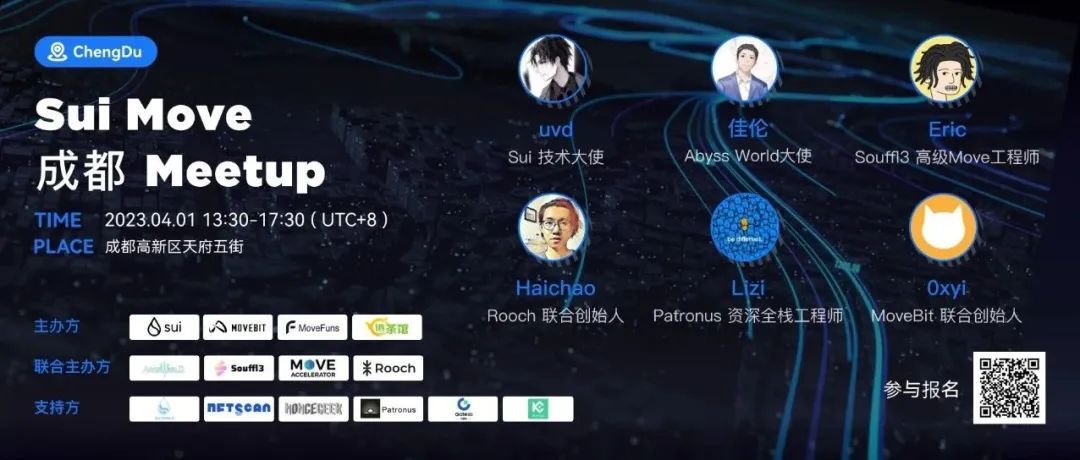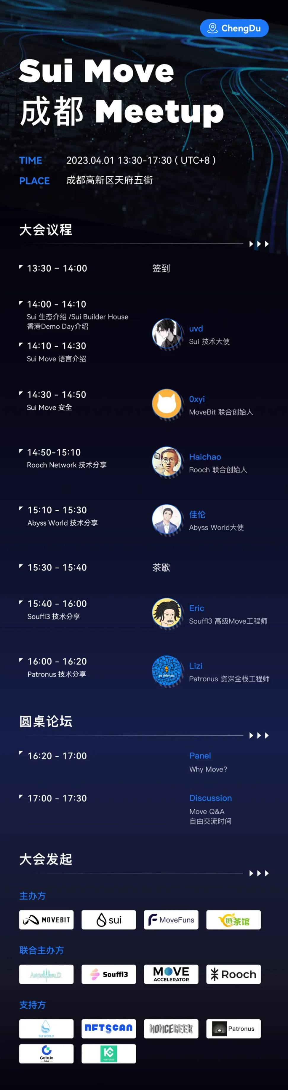 北京时间 4 月 1 日下午 1:30,由 MoveBit 联合 Sui 基金会,MoveFuns DAO,链茶馆,Abyss World,Souffl3,Move Accelerator, RoochNetwork 共同举办的 Sui Move 成都 Meetup 将在成都高新区天府五街举行。