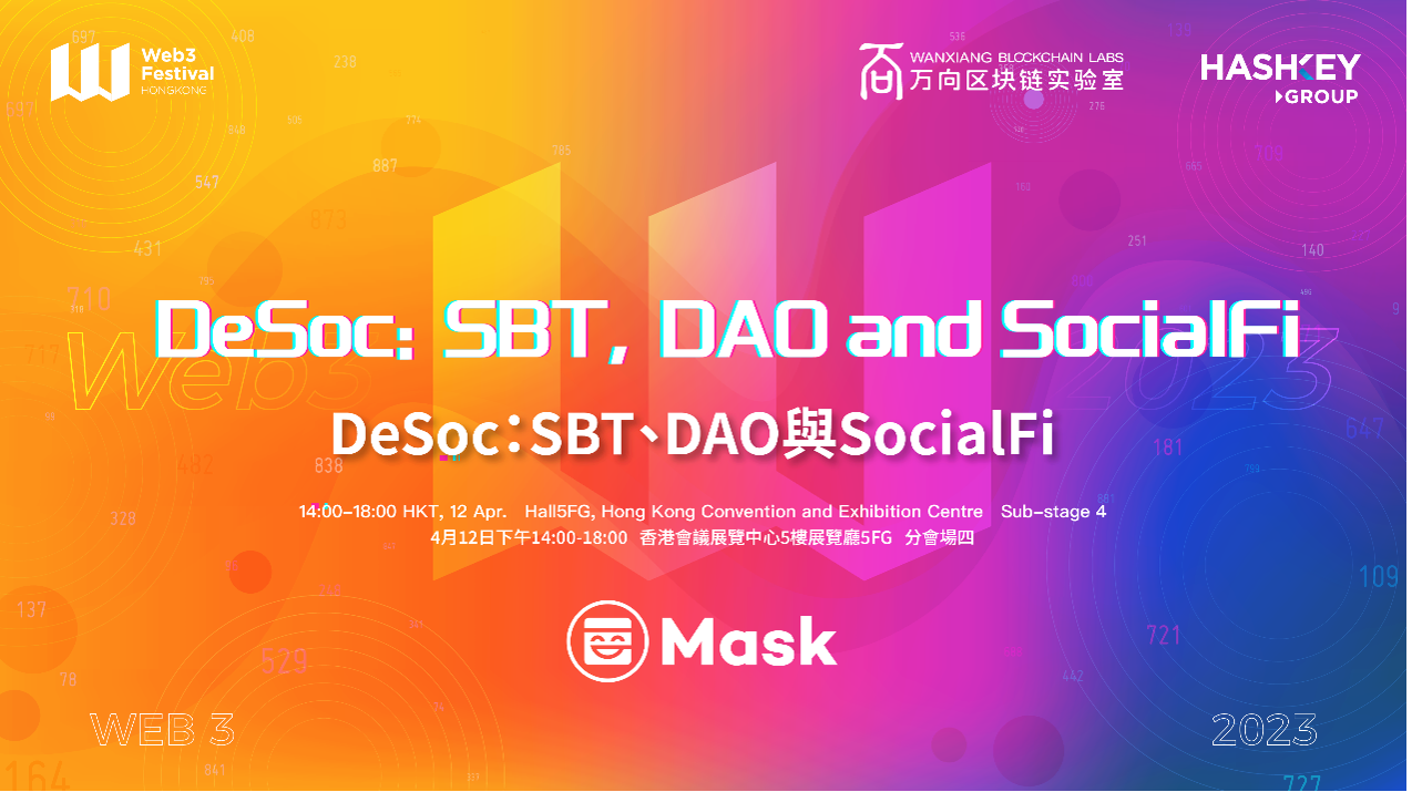 4 月 12 日下午,2023 香港 Web3 嘉年华「DeSoc:SBT、DAO 与 SocialFi」主题论坛将在香港会议展览中心 5 楼 5F 展厅分会场四精彩呈现。本次主题论坛由大会主办方万向区块链实验、HashKey Group 携手联合组织者 Mask Network 共同策划,共建丰富议程,将通过 5 场主旨演讲、2 场圆桌讨论与 1 场围炉谈话,邀请 SBT、DAO、SocialFi 相关赛道的知名项目创始人、负责人交流探讨 DeSoc 领域的机遇与挑战。
