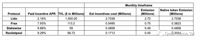 上表是目前排名前 4 的 LSD 协议的市盈率。Frax 由于其高 FDV 而表现最差。但是,应该注意的是,Frax 不仅提供 LSD 服务,而且还拥有其他产品,稳定币发行量为 $1.51B。Frax 是唯一一个与原生代币具有收益分享模型的协议,其中 veFXS 持有者有权获得 8% 的抵押收益。随着 frxETH 在短短 4 个月内获得 1.62% 的市场份额的惊人增长来看,很明显,只要 frxETH 的收益率高于其竞争对手,它就会继续增长。