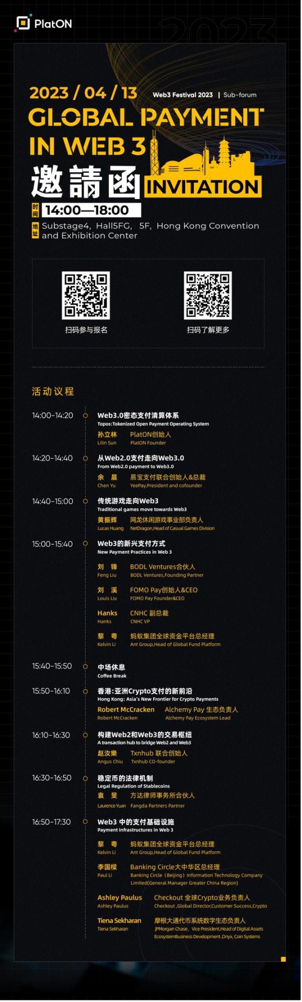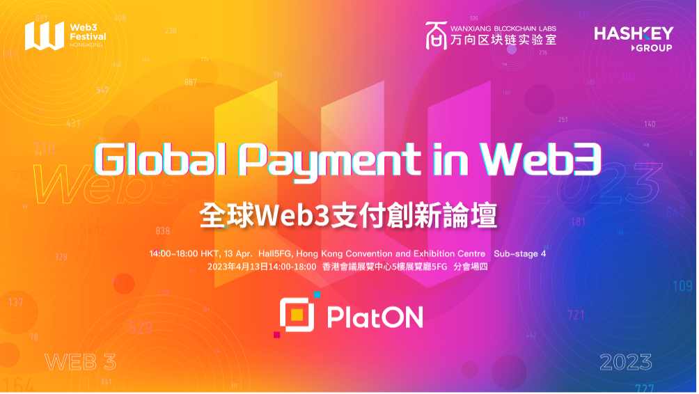 4 月 13 日下午,由全数字化公共基础设施 PlatON、万向区块链实验室及 HashKey Group 主办的「全球 Web3 支付创新论坛(Global Payment in Web3)」将在 2023 香港 Web3 嘉年华活动现场分会场四正式召开。