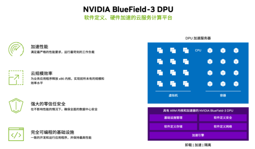 简单地说,NVIDIA BlueField-3 DPU 可以提升整个网络性能,配合高算力 GPU ,可以支撑更大规模的大语言模型训练,从而缩短训练时间。根据模型需求动态调整部署以共享算力资源,并应对不同规模的模型训练;提升服务器能效、释放算力资源,用更少的服务器完成更多的任务,从而帮助企业实现节能环保、降本增效。