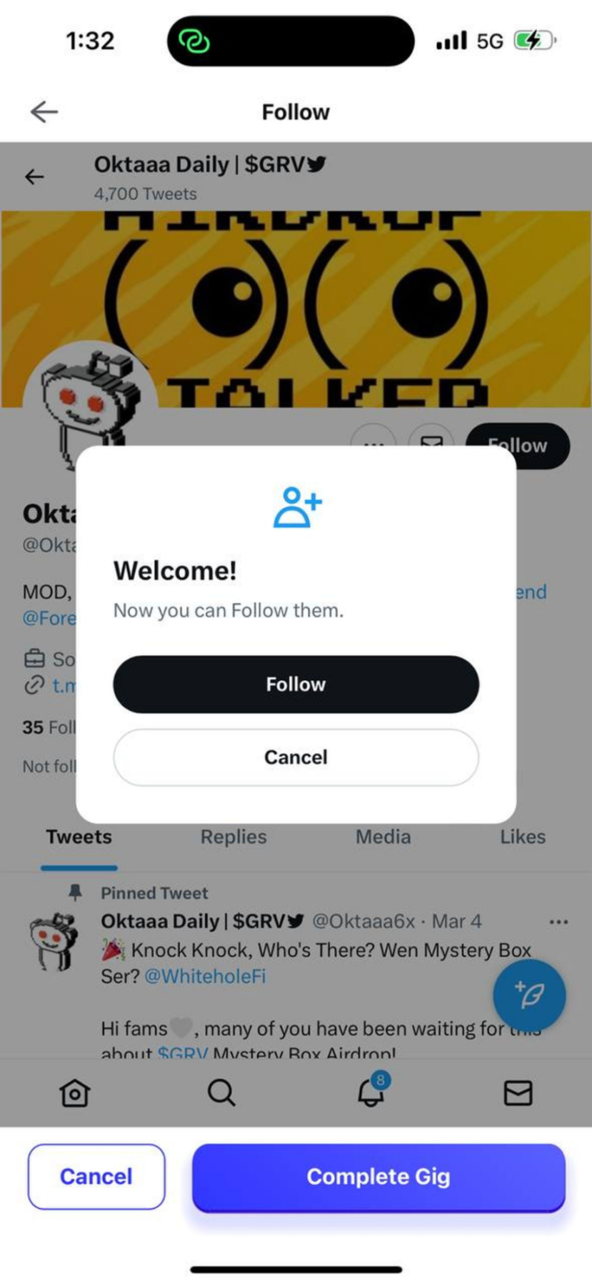 注意:每个任务中,你需要点击关注,喜欢,回复,和转发。每个动作完成,记得再点击 “已完成 Completed”。
