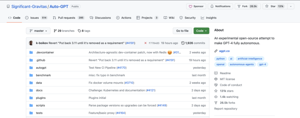 图:Auto-GPT 在 GitHub 上已获 131k+Star