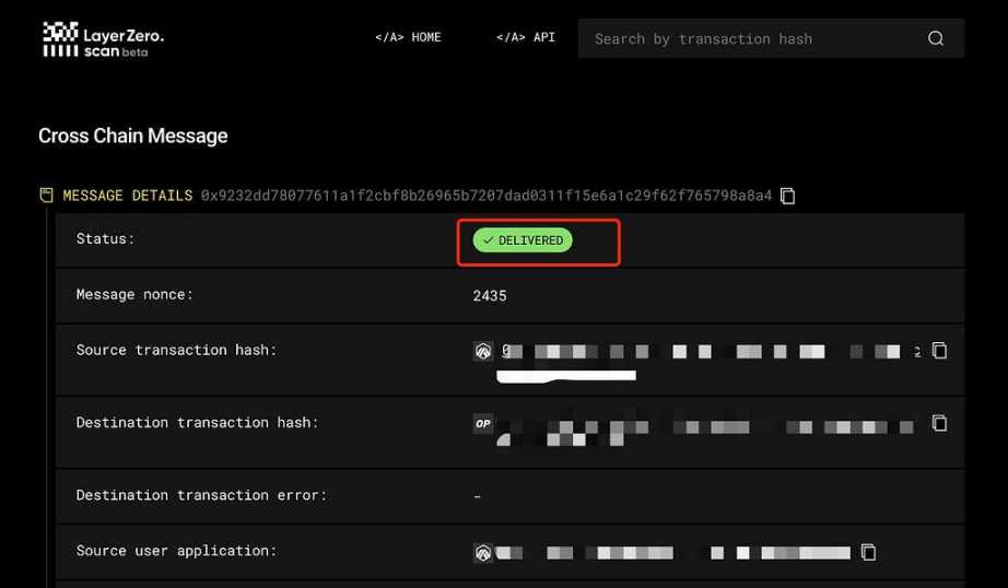 成功后可以看到一条 layerzero 的哈希值