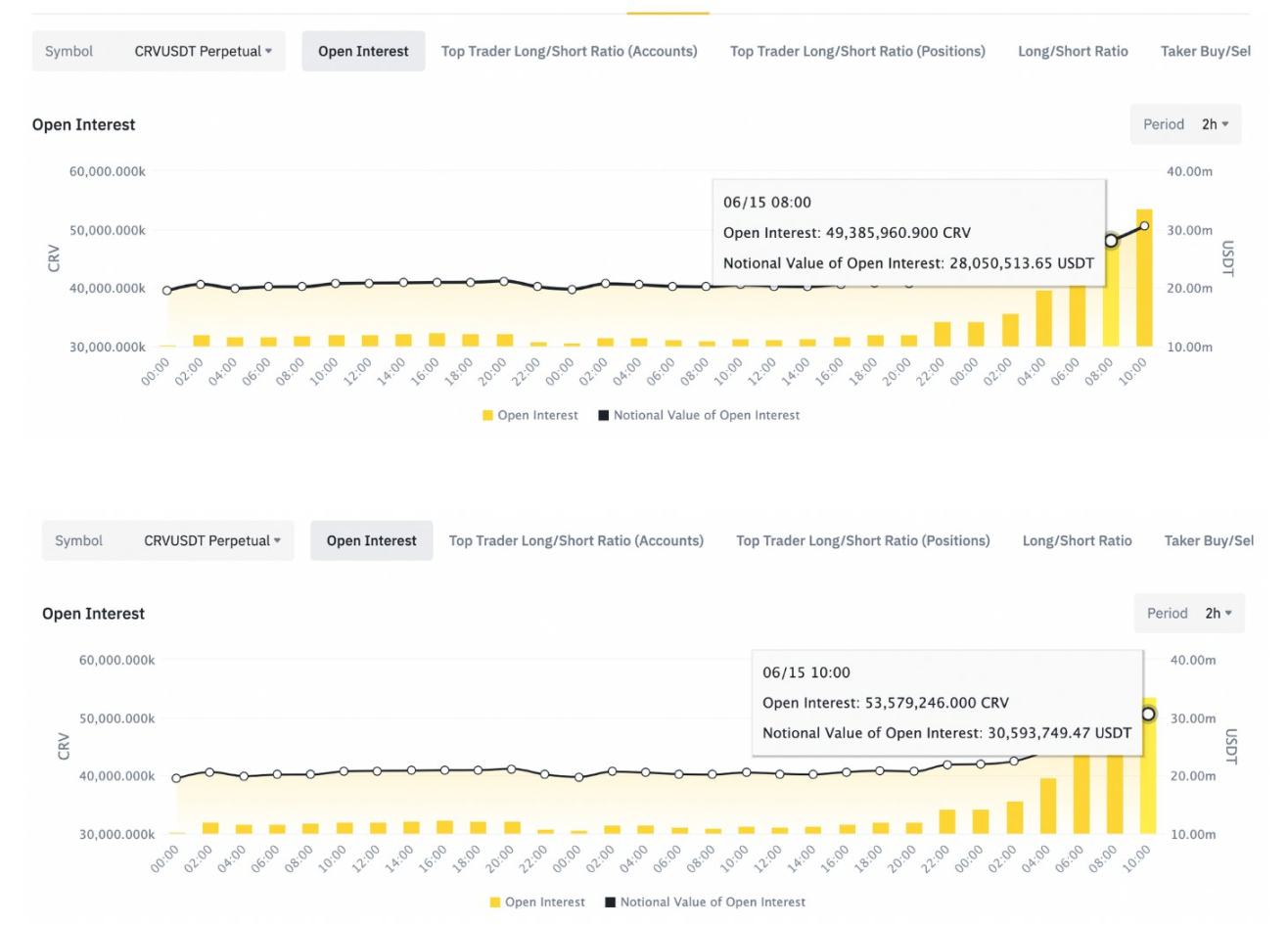 虽然链上借 CRV 的途径较少,但链上 CRV 现货抛压较大, 并且,过去 6 小时中心化交易所的做空行为增长显著 (190%+ APY on BN to short CRV),OI 两小时增加 500w, 24hr 增加 1400w。